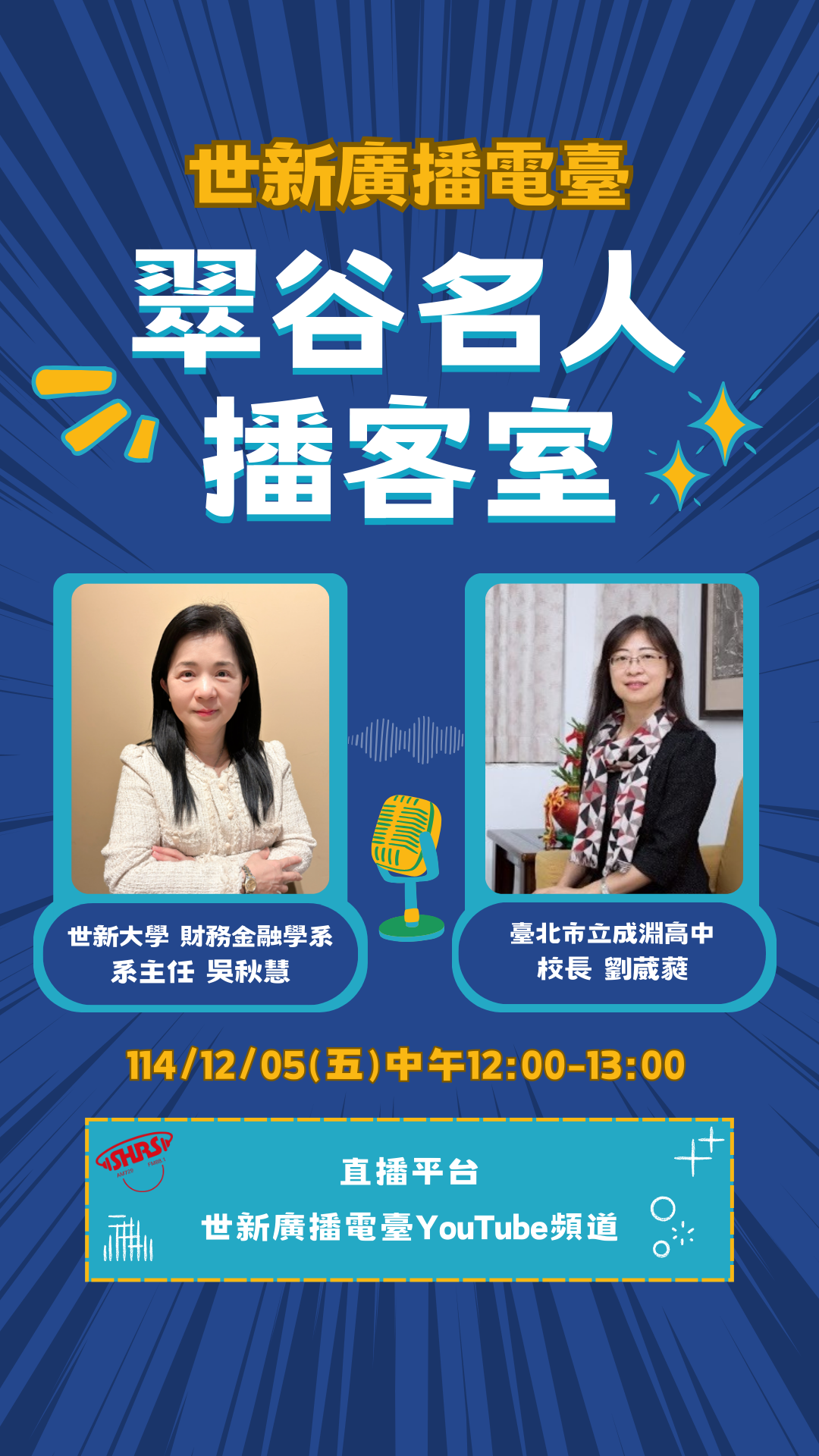 本次Live Podcast「翠谷名人播客室」,將特別邀請到《臺北市立成淵高級中學校長 劉葳蕤女士》蒞臨節目。主持人由《財務金融系系主任 吳秋慧》親自主持,將以幽默風趣開場白揭開序幕。